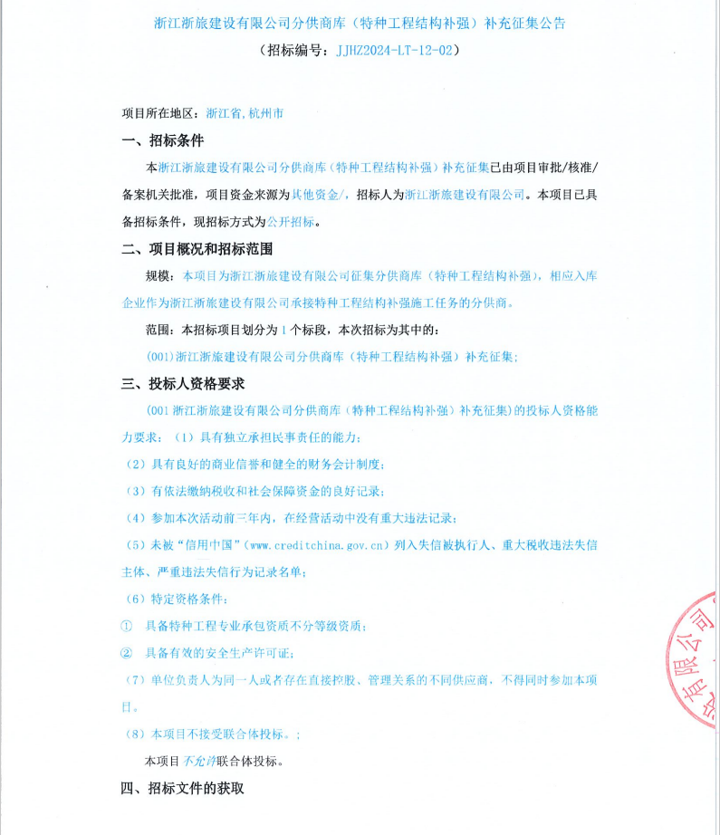 浙江浙旅建設(shè)有限公司分供商庫(kù)(特種工程結(jié)構(gòu)補(bǔ)強(qiáng))補(bǔ)充征集公告